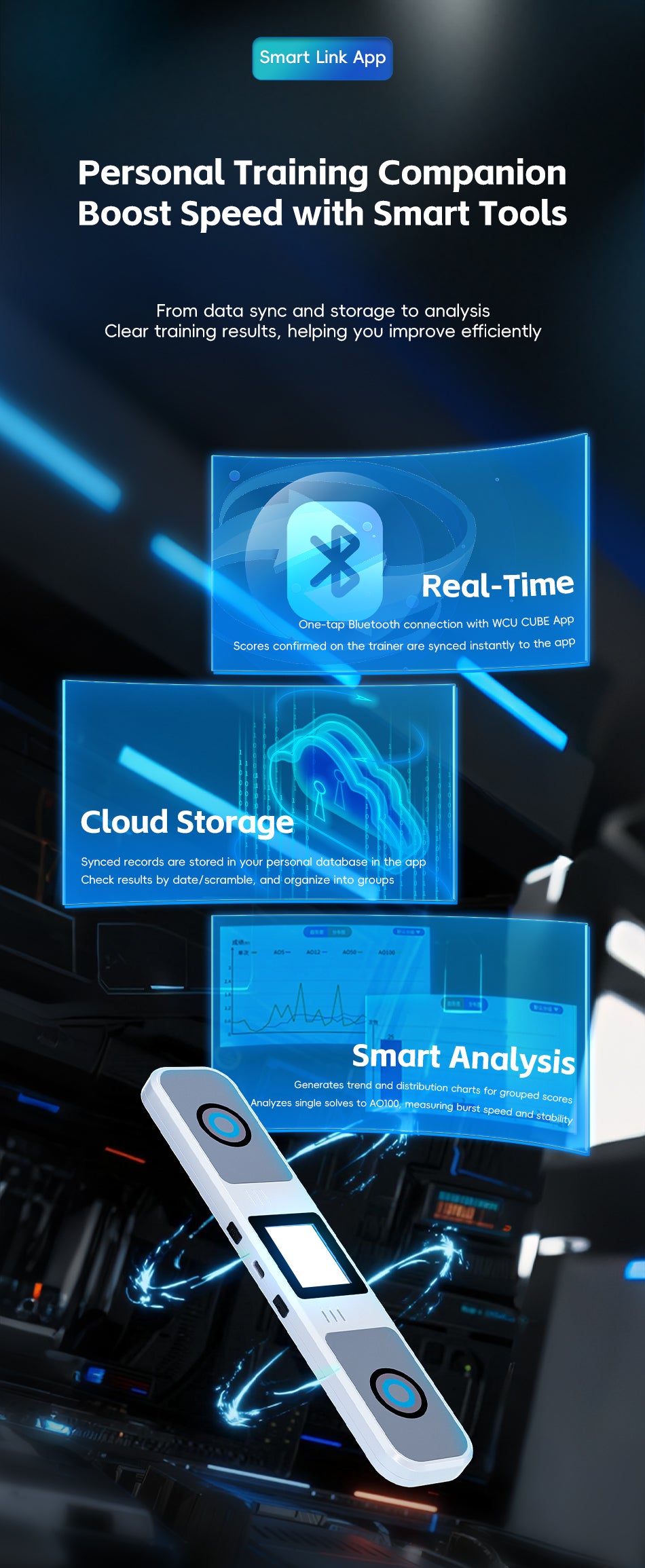 Bluetooth syncing saves every solve to the app, making long-term improvement measurable and organized. -